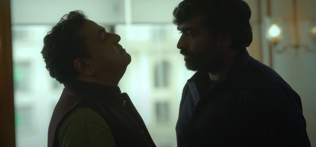 Well, it is not just Sunny-Firoz, but Michael and his boss Pawan Gehlot [Zakir Hussain] also work brilliantly as a pair. There is one difference though, the latter share a quid pro quo relationship. Imagine here is a Special Task Force officer who is literally blackmailing the Finance Minister, not for any personal gains, but to simply arm him with the tools needed to fight the raging counterfeit menace. There are veiled threats from Michael, while open ones from Gehlot. It is hilarious how Michael tells Pawan that he is looking cute in a compromising position photo. Gehlot threatens to reopen Michael’s past blunder. The duo is not afraid to use cuss words in their conversation. Despite all the swearing, intimidation, they share a common national interest. Hussain has long been an unheralded gem of Hindi cinema, television. Farzi is just another feather in the cap for the seasoned artiste. As for Sethupathi, the message is clear – he belongs to any cinema.